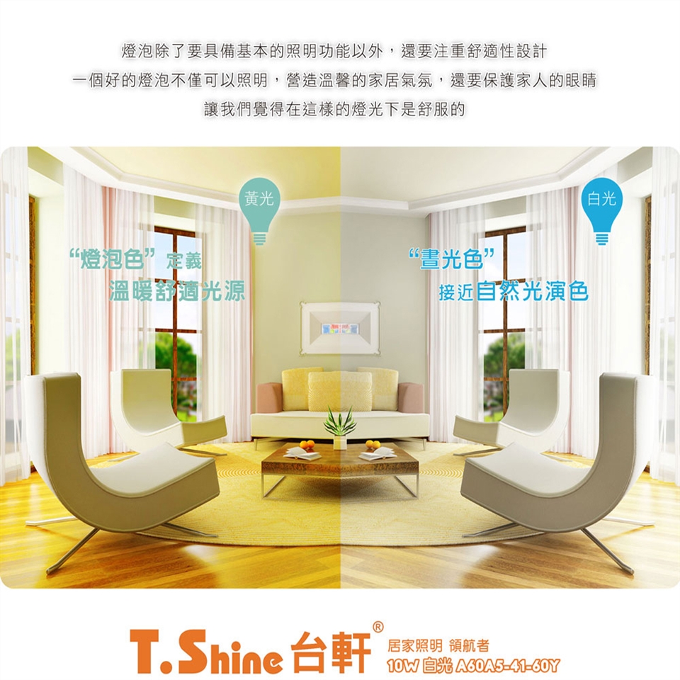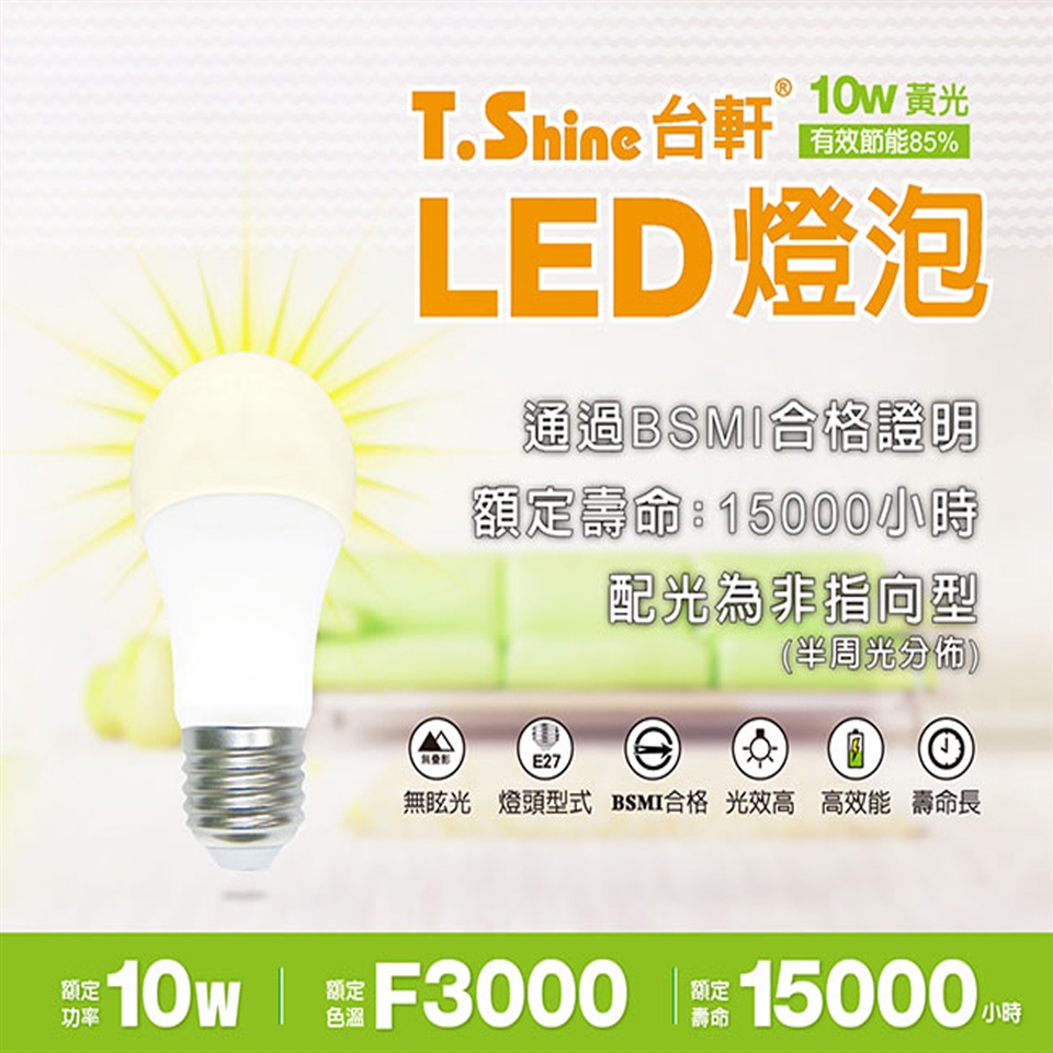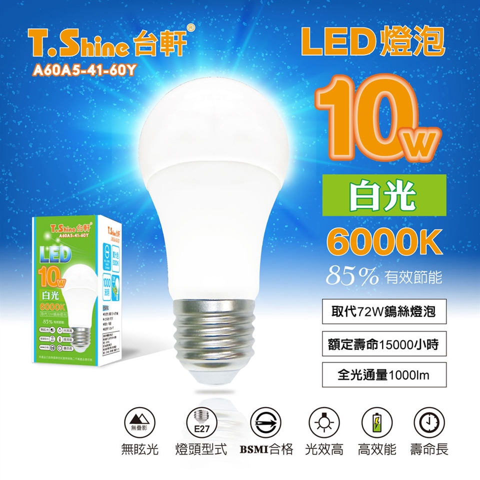 商品訊息簡述: 良好的鋁材散熱結構 光學透光玻璃 無眩光 無疊影 額定壽命15000hrs 商品名稱 台軒T Shine品牌 T Shine台軒種類 燈泡型號 A60A5 41 60Y白光A60A5 41 30Y黃光類型 LED燈" />